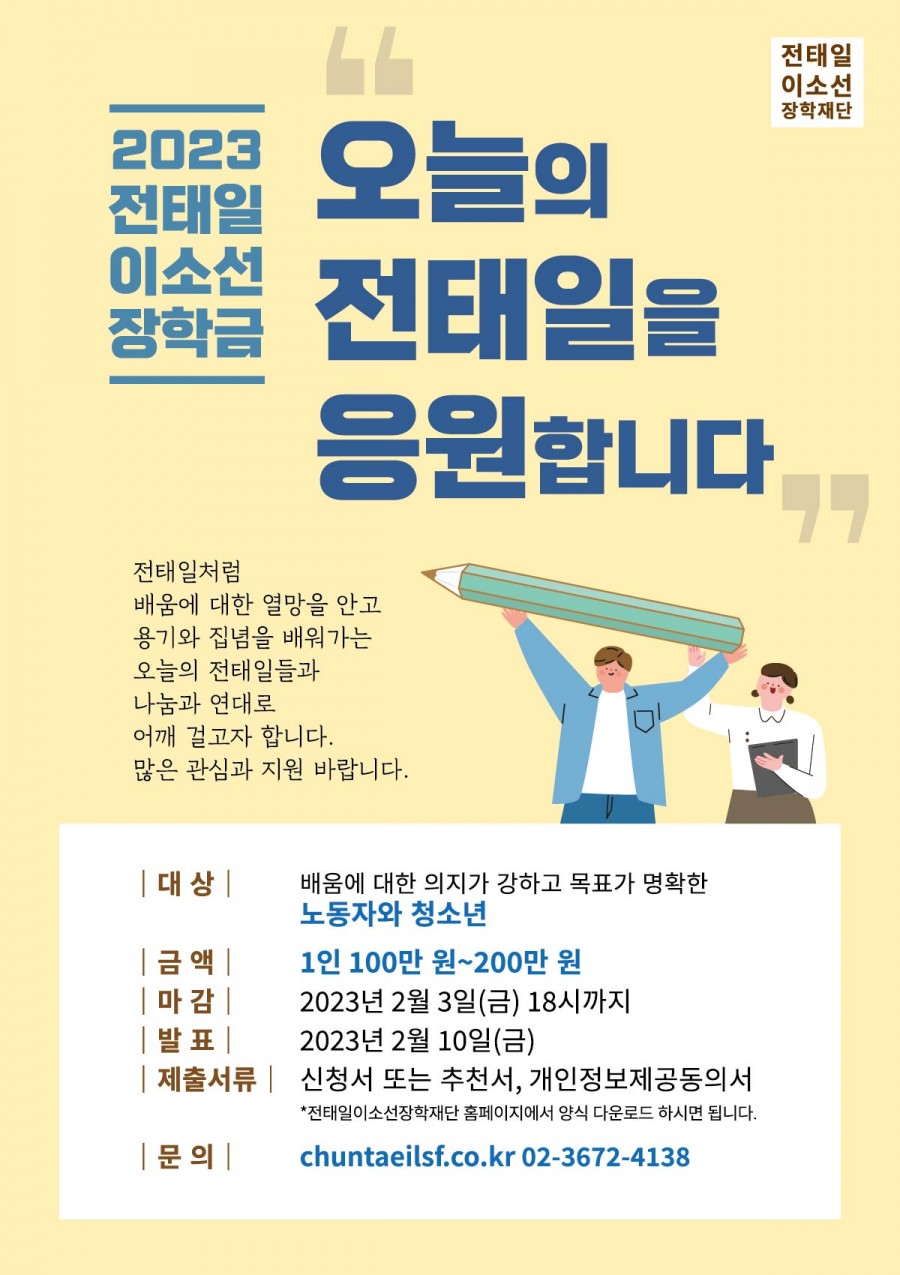 전태일처럼 배움에 대한 열망을 안고 용기와 집념을 배워가는 오늘의 전태일들과 나눔과 연대로 어깨 걸고자 합니다. 많은 관심과 지원 바랍니다.